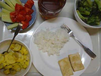 ...dinner was once again eaten in front of the TV...some more of the gifted squash, stewed with onions...rice, baked tofu (I put some Heinz 57 on that)...some George Foreman grilled broccoli...and some more cucumbers and gifted tomatoes...