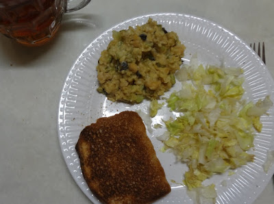 ...this is actually the first time I've ever made this simple dish...and I really like it...it's just rice and tomatoes...she called it 'Maters and Rice... ...I had that with some defrosted garbanzo beans from the freezer...and some Bread and Butter pickles...after I took the photo I stired some crumbled Nori into the garbanzos too... ...I know I said I wasn't snacking...but I was hungry after noon...so I heated up this little bit of leftover edamame...it was not much of a snack but it was good... ...for dinner...the last of green tomatoes had started to ripen...but that didn't stop me from 'frying' them up in the Foreman Grill... ...made a small cake of vegan cornbread... ...sliced into a slice and filled it with Earth Balance... ...steamed some squash and onions... ...and heated up a couple of muffin cups of beans from the freezer...